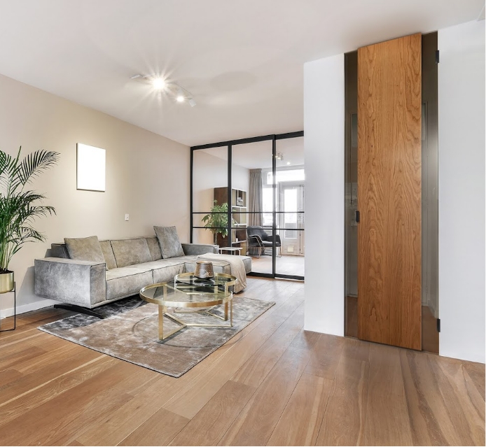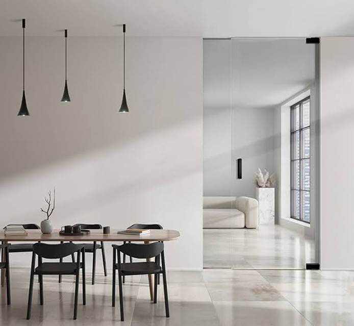 ドアが壁と一体化して見えるため、空間が広く感じられる、スタイリッシュなデザイン。